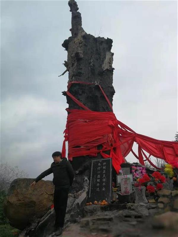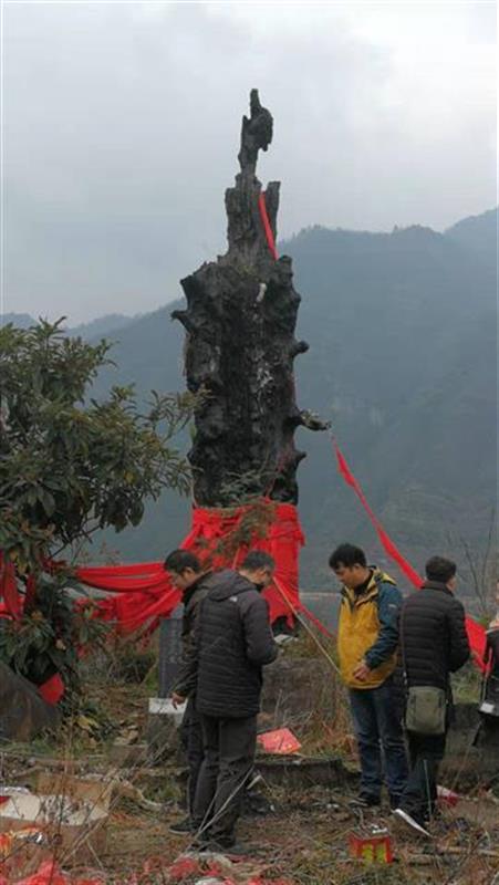 古树位于沙镇溪镇范家坪村一组。记者看到古树已没了树冠,只剩下焦炭状的躯干,身上缠裹红布。村干部介绍,古树生前6人合抱,周边建有护墙,树上有保护铭牌。