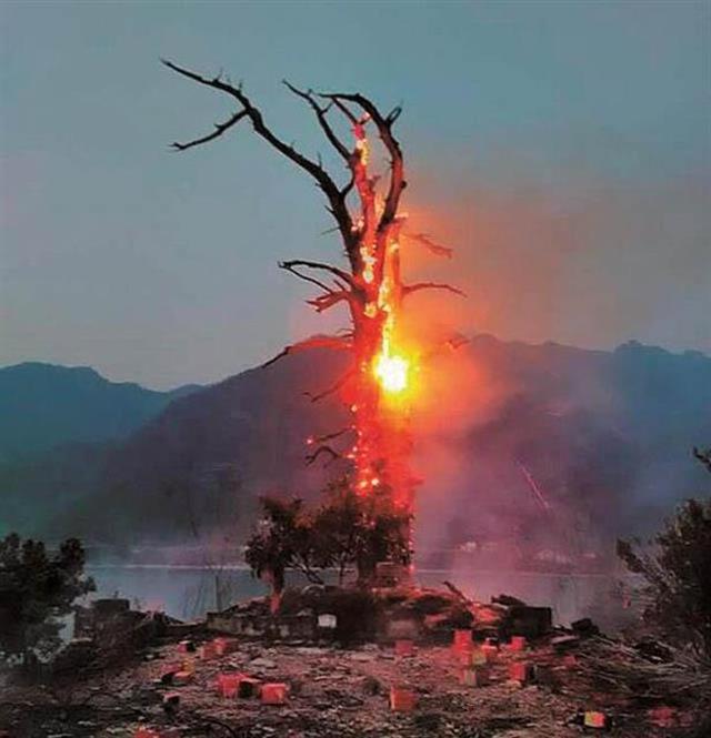 记者前不久在秭归县三峡库区采访,发现库岸江边站立着一株烧枯的千年古油杉树,似乎在向过往的人们诉说被焚的不幸遭遇。