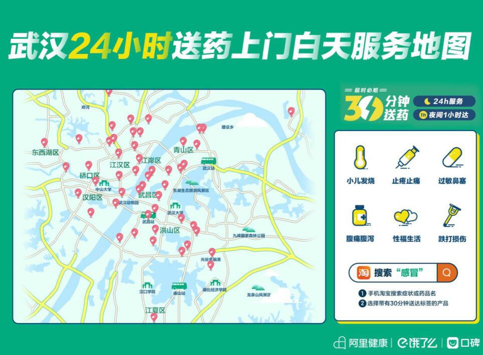 3月25日,阿里健康联合口碑饿了么,与武汉数十家线下药店牵手,在当地开通24小时全天候送药服务,或能帮助武汉市民解决上述痛点。
