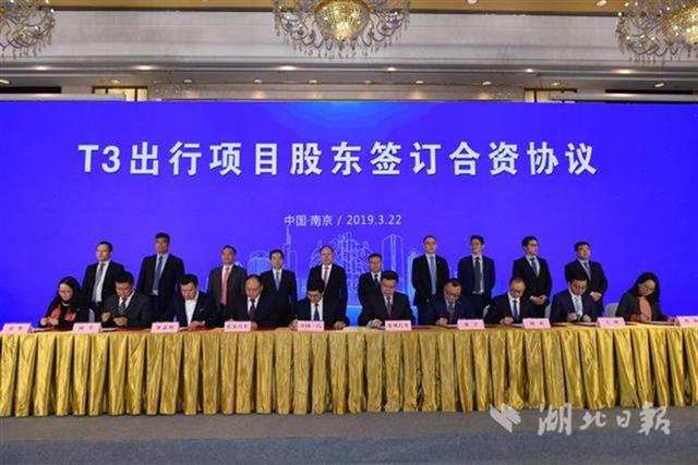 湖北日报讯(记者李剑军、通讯员邓金龙、成凯)挑战滴滴的移动出行巨无霸来了!3月22日,东风汽车集团有限公司、中国第一汽车集团有限公司、重庆长安汽车股份有限公司三大汽车央企联合腾讯、阿里、苏宁等互联网企业在南京签订合资协议,共同出资97.6亿元成立T3出行公司。同时,T3出行公司签约落户南京市江宁经开区。