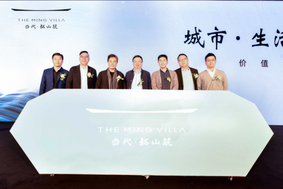 分享会的最后一个环节,是全场瞩目的启动仪式——当代地产董事长陈海淳先生,当代地产副总经理,当代弘明总经理丁中淇先生,以及张清平先生、钱明波先生、姜海龙先生等诸位嘉宾共同上台,触动按键,在3D全息投影中,当代·铭山筑的建筑轮廓逐渐清晰展现,与世界正式见面。