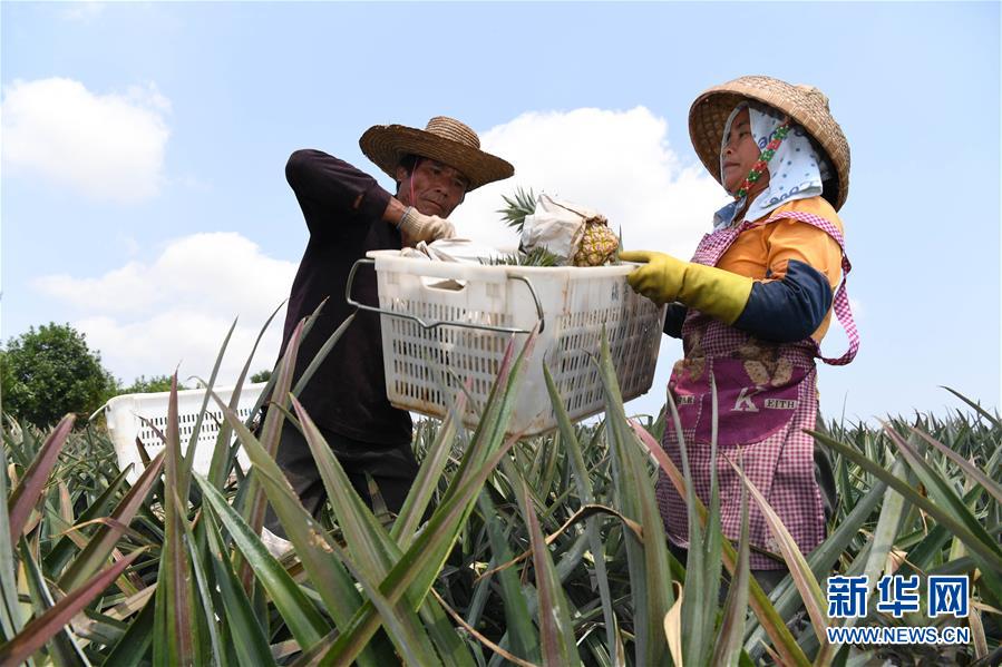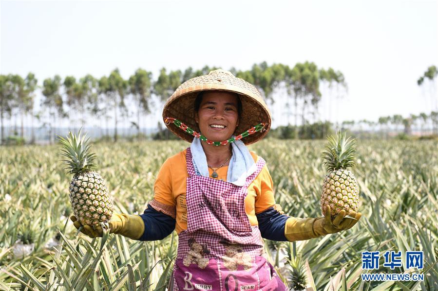 - 3月28日,广东农垦徐闻红星农场职工在田间展示采摘的菠萝。 近日,广东省湛江市徐闻县的菠萝种植农场迎来今年的首批采摘。徐闻县是菠萝生产大县,种植面积约30万亩,被称为“菠萝的海”。 新华社记者 邓华 摄