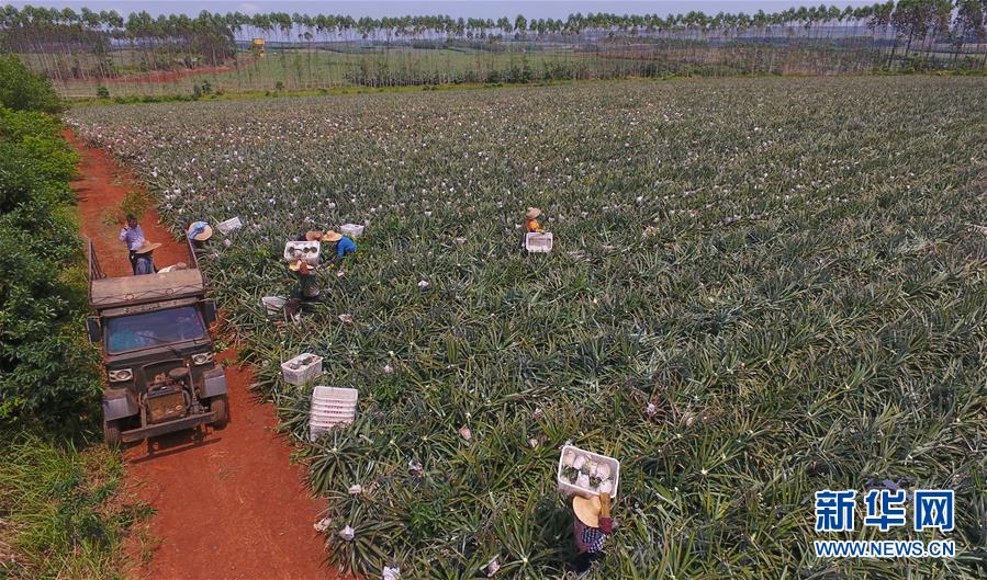 - 3月28日,广东农垦徐闻红星农场职工在田间采摘菠萝(无人机拍摄)。 近日,广东省湛江市徐闻县的菠萝种植农场迎来今年的首批采摘。徐闻县是菠萝生产大县,种植面积约30万亩,被称为“菠萝的海”。 新华社记者 邓华 摄