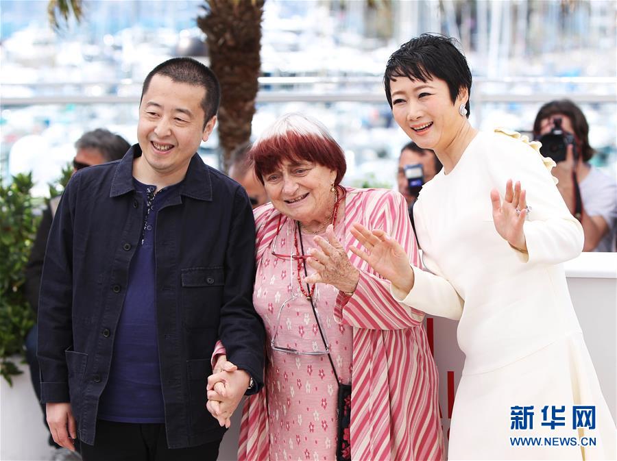 这是2013年5月17日,在第66届戛纳国际电影节上,法国女导演、“金摄像机”单元评委会主席阿涅丝·瓦尔达(中)与中国导演贾樟柯(左)、女演员赵涛在拍照式上合影留念的资料照片。 新华社记者高静摄