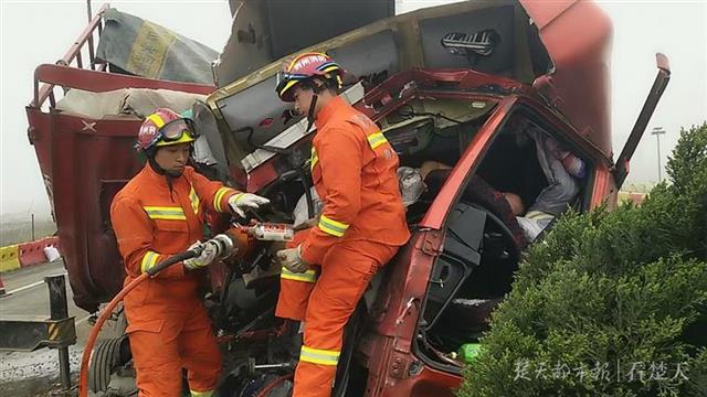 楚天都市报3月31日讯(记者高伟 通讯员杨秋 李帅)3月29日上午8时许,随岳高速公路监利往岳阳方向,一辆载有30吨铝材的半挂车追尾一辆载有30头牛的全挂车,造成半挂车副驾驶上一男子被困,受到惊吓的30头牛在车厢内不停折腾,情况非常危险,接到报警的当地消防救援部门迅速赶赴现场开展救援。
