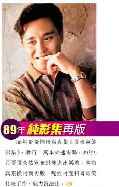 1989年,张国荣为写真集《张国荣纯影集》再版拍摄写真,照片中的张国荣笑容亲切,用嘴咬着食指,魅力十足。同年9月张国荣宣布退出乐坛,当时许多人觉得十分惋惜。