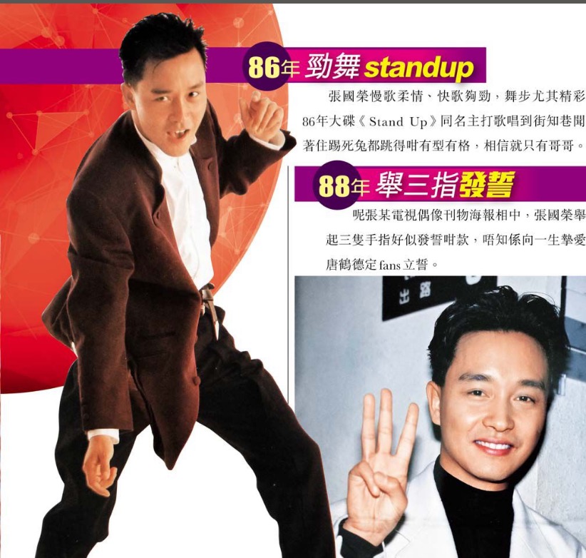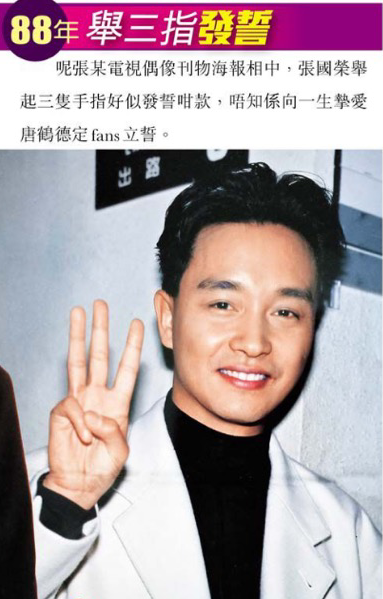 1988年,张国荣为某电视剧刊物拍摄海报,当时他举起三只手指作发誓姿势,当时这个手势也引起了一阵热潮。