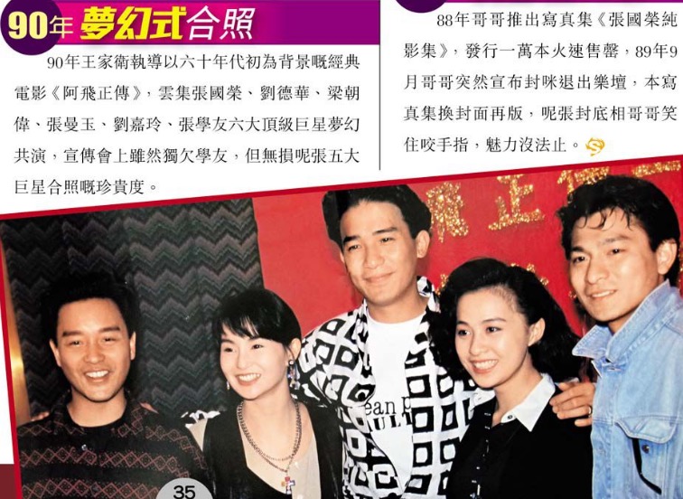 1990年,张国荣参与王家卫电影《阿飞正传》,参与拍摄这部片的还有张曼玉、梁朝伟、刘嘉玲、刘德华、张学友等大牌巨星,当时除了张学友不在场外,其他五位演员拍摄了一组合照,现在看回来这张集合了香港五大巨星的照片也是十分珍贵了。