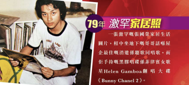 1979年,张国荣的一张罕见的家居照曝光,照片中的张国荣穿着居家的T恤和裤子盘地而坐,手中拿着一张黑胶唱碟,正在听歌打发时间。
