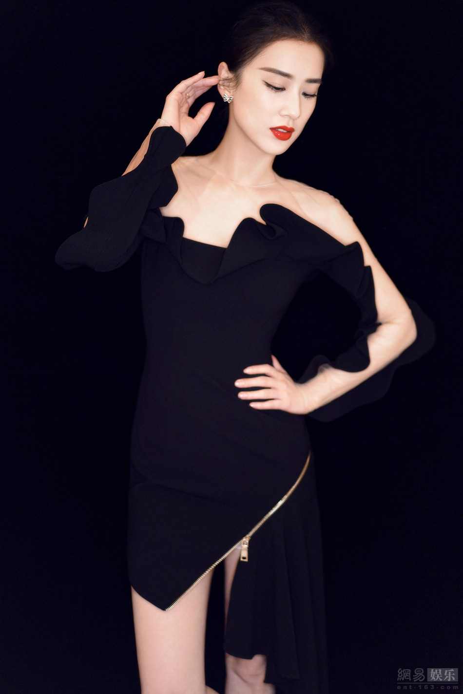 3月31日,黄圣依参加某婚纱礼服时装秀,黄圣依身穿设计感极强的不对称黑色礼服,礼服的荷叶边与拉链设计别出心裁,突显出黄圣依高雅的气质和完美的身材。