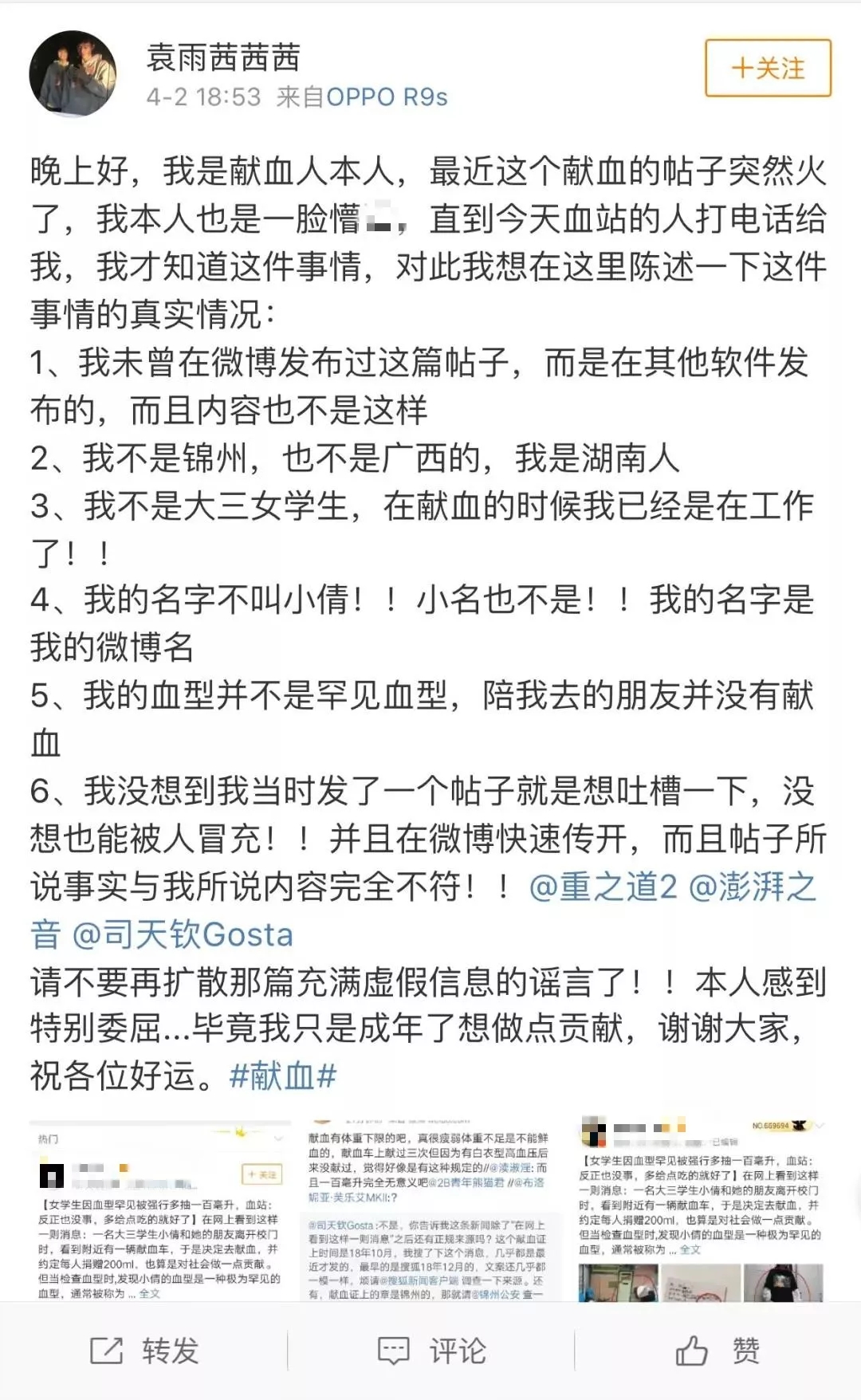 辟谣君发现,该消息的较早来源是网易号“小猫可可星座”于3月31日下午发布的一则消息《女学生因血型罕见被强行多抽100毫升,血站:反正也没事,多给点吃的就好了》。