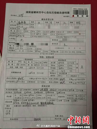 当事人献血档案。郴州市中心血站提供