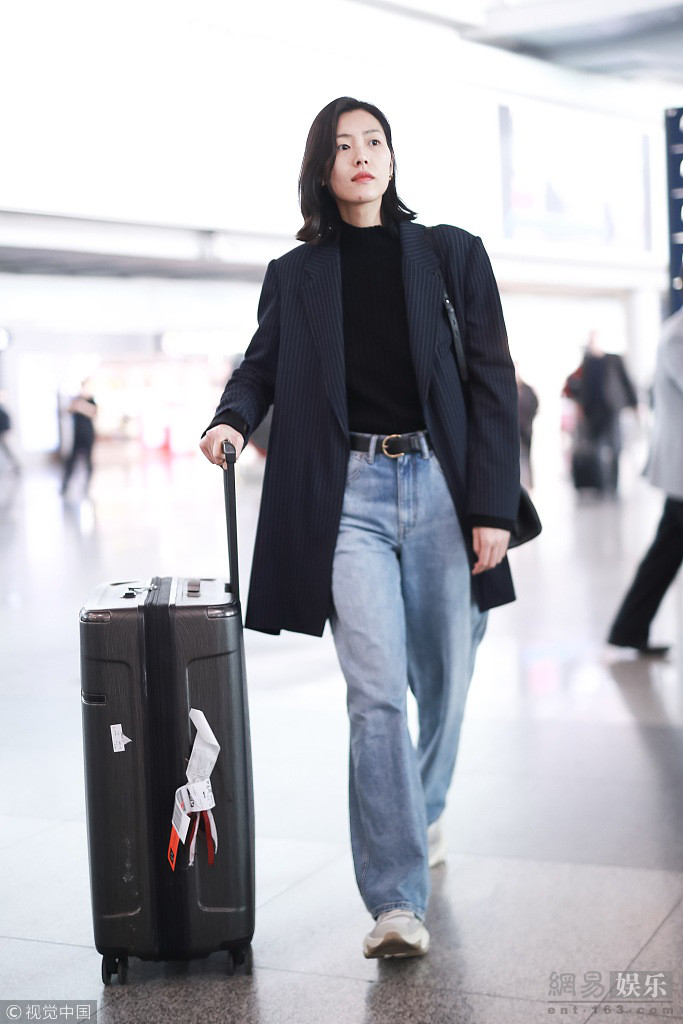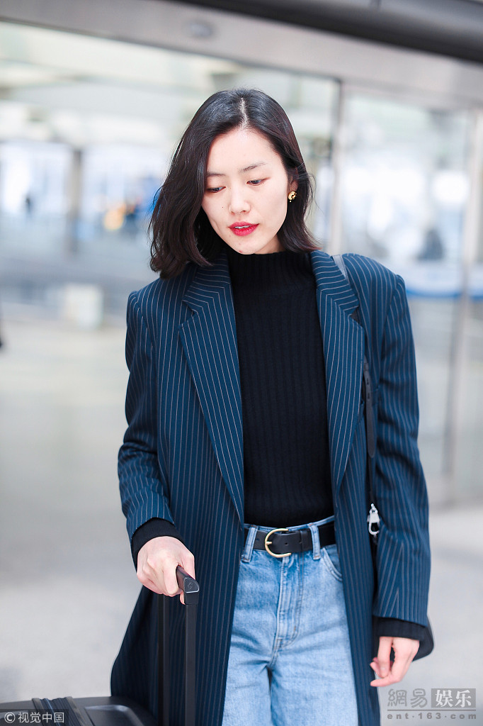 刘雯现身北京机场,她身穿藏蓝色oversize西装外套搭配浅蓝色牛仔裤,自推行李箱变商务精英气场两米八,迈大长腿烈焰红唇御姐范。