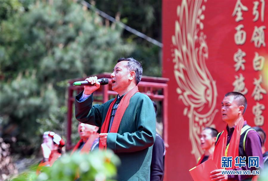 4月6日,主祭人钟金水(左)带领茶农在仪式上高喊“开山采茶啰”。 当日,“首届闽东畲族喊山祭茶典礼”在福建省福鼎市太姥山镇方家山村举行。 近年来,福建省福鼎市大力发展特色茶产业,将茶产业打造成为福鼎市乡村振兴和百姓致富的绿色产业、支柱产业。2018年该市茶园面积达20.3万亩,涉茶总产值达56.88亿元。 新华社记者 林善传 摄