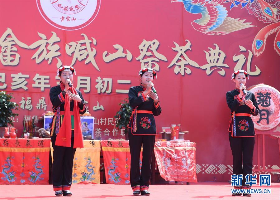 4月6日,身穿畲族服饰的采茶姑娘在“喊山祭茶”仪式上唱采茶歌。 当日,“首届闽东畲族喊山祭茶典礼”在福建省福鼎市太姥山镇方家山村举行。 近年来,福建省福鼎市大力发展特色茶产业,将茶产业打造成为福鼎市乡村振兴和百姓致富的绿色产业、支柱产业。2018年该市茶园面积达20.3万亩,涉茶总产值达56.88亿元。 新华社记者 林善传 摄