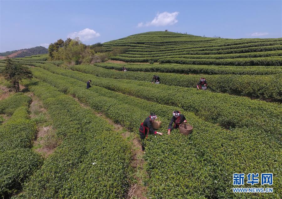 4月6日,茶农在福鼎市太姥山镇方家山村采茶(无人机拍摄)。 当日,“首届闽东畲族喊山祭茶典礼”在福建省福鼎市太姥山镇方家山村举行。 近年来,福建省福鼎市大力发展特色茶产业,将茶产业打造成为福鼎市乡村振兴和百姓致富的绿色产业、支柱产业。2018年该市茶园面积达20.3万亩,涉茶总产值达56.88亿元。 新华社记者 林善传 摄
