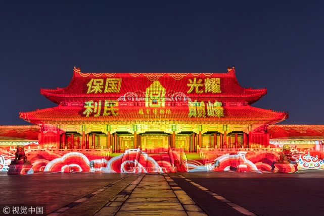 活动当天太和门上打出的“保国利民,光耀巅峰”标语,被质疑有广告的嫌疑