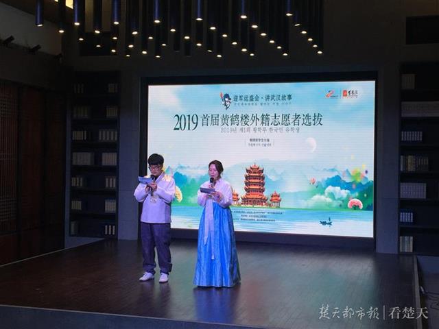 楚天都市报4月8日讯(记者雷艳 通讯员王红念 江萌)今日下午,“迎军运盛会 讲武汉故事——2019首届黄鹤楼外籍志愿者选拔活动”韩国留学生专场在武汉黄鹤楼公园举行。来自武汉大学、华中师范大学等高校的韩国留学生们,声情并茂地讲述了自己和武汉的故事,并朗诵了中文诗词、演唱了中文经典歌曲等,现场掌声不断。最终,5名韩国留学生脱颖而出,成为本场活动的优胜者。