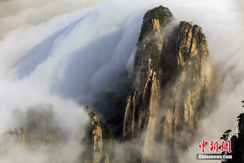 - 4月10日,安徽黄山风景区现壮丽的日出云海景观,云雾翻腾,缠绕山峰。文/图 刘浩 叶永清
