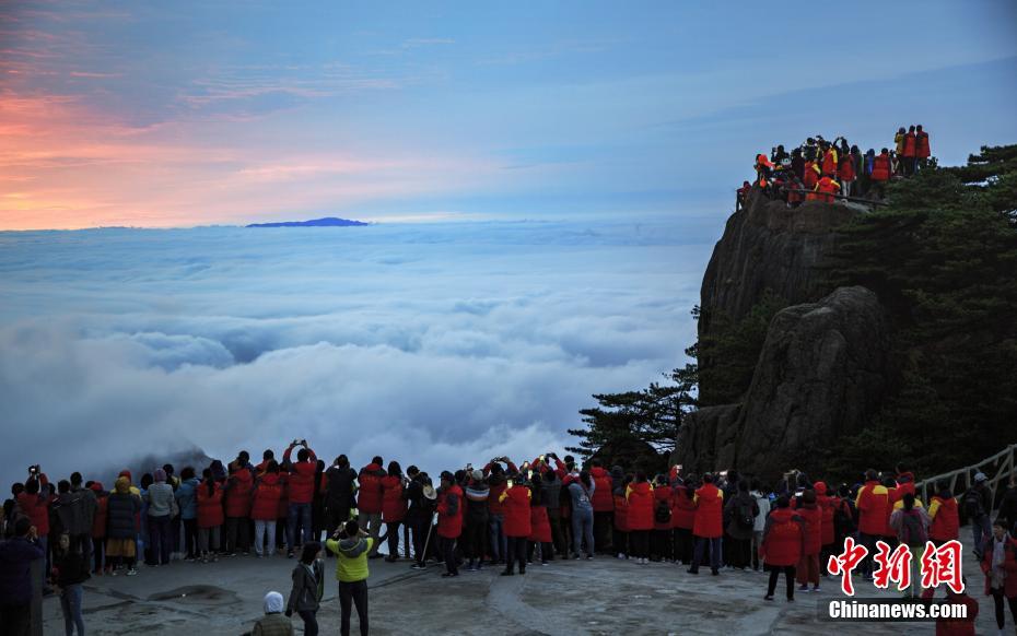 - 4月10日,安徽黄山风景区现壮丽的日出云海景观。游客聚拢黄山峰顶,等待日出景观。文/图 刘浩 叶永清