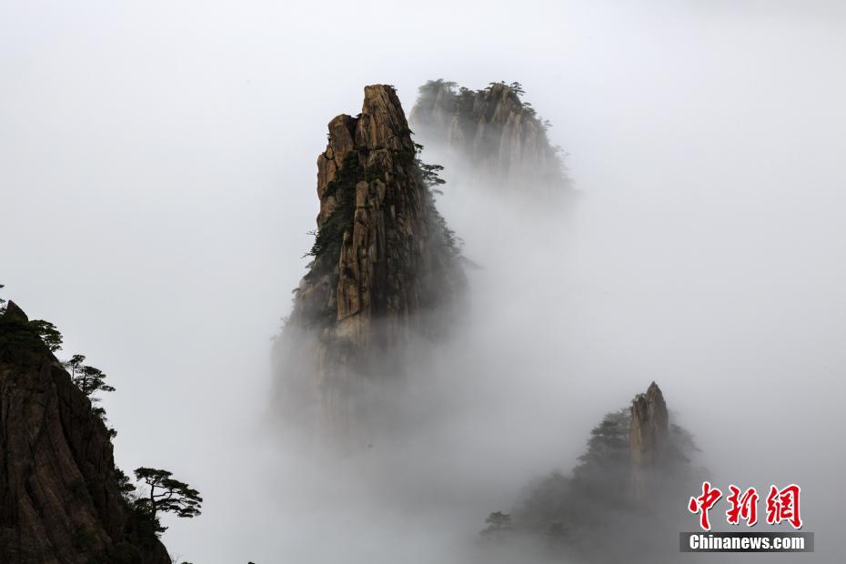 - 4月10日,安徽黄山风景区现壮丽的日出云海景观。奇峰怪石在云雾之间若隐若现。文/图 刘浩 叶永清