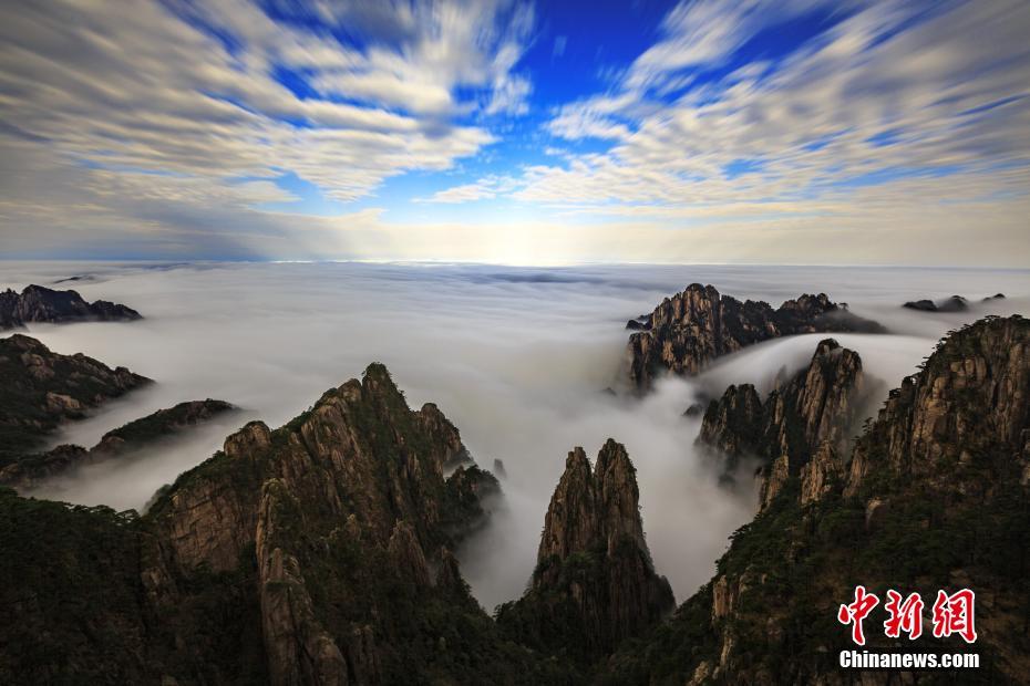 - 4月10日,安徽黄山风景区现壮丽的日出云海景观。黄山上空,云天万里,山峰与云海竞秀。文/图 刘浩 叶永清