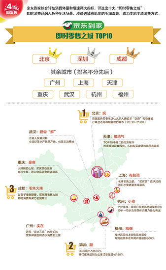 “415”四周年庆前夕,京东到家综合评估消费体量和增速两大指标,评选出十大“即时零售之城”,TOP3依次是:北京、深圳、成都,其余登榜的有广州、上海、天津、重庆、武汉、杭州和福州。这些喜提“即时零售之城”的城市,依托互联网平台赋能和即时配送网络的完善,即时消费已融入各种生活场景,渗透进城市肌体的毛细血管,成为本地主流消费方式,全方位提升市民生活品质。