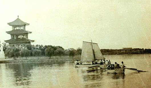 - 图为:桨声阁影。1958年,东湖行吟阁旁的舢板比赛。行吟阁落成于1954年,是东湖风景区的标志性景观。