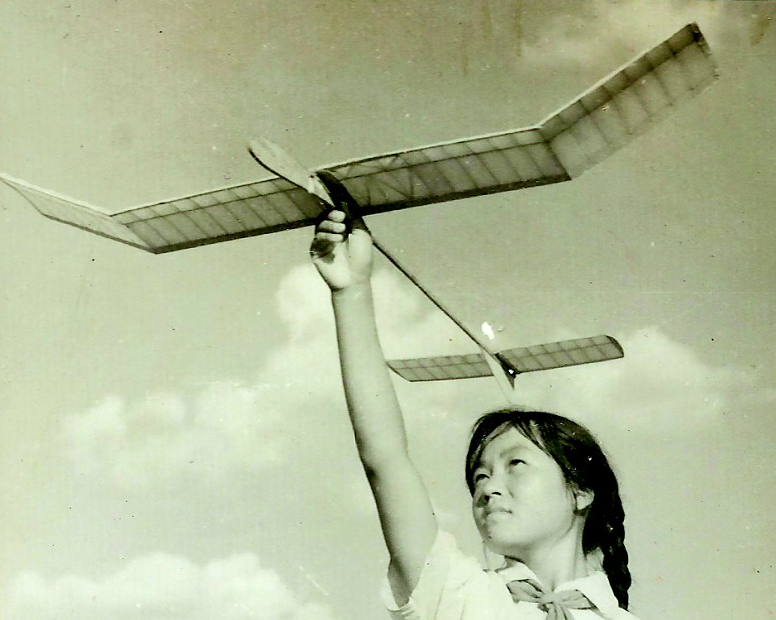 - 图为:1957年,蓝天白云下,手托牵引滑翔航模的武汉少先队员。
