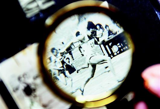 - 图为:2019年3月22日,陈勇手持放大镜聚焦在一张老照片上。画面中展示的是1959年第三届湖北省运动会上男子百米短跑的冲刺场面。