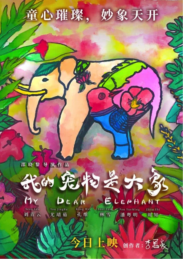 童心版海报中,造型可爱的大象在粉红色天空中飞翔,四周盛开的花朵奇幻而艳丽,大象身上的色彩印记,是小朋友心中独一无二想象力的表达。大象的腿上,一只花尾小鸟惟妙惟肖,鸟身与象腿的完美重合,在孩子们的心目中,也许这正是让大象飞起来的方法。据悉,这版海报由电影中的主演、演员孔维发起的传梦公益基金所支持的、云南资教工程小学小朋友们创作,正如影片中鲜活可爱的形象活灵活现,也符合了电影“妙象天开、让爱回家”的主题。