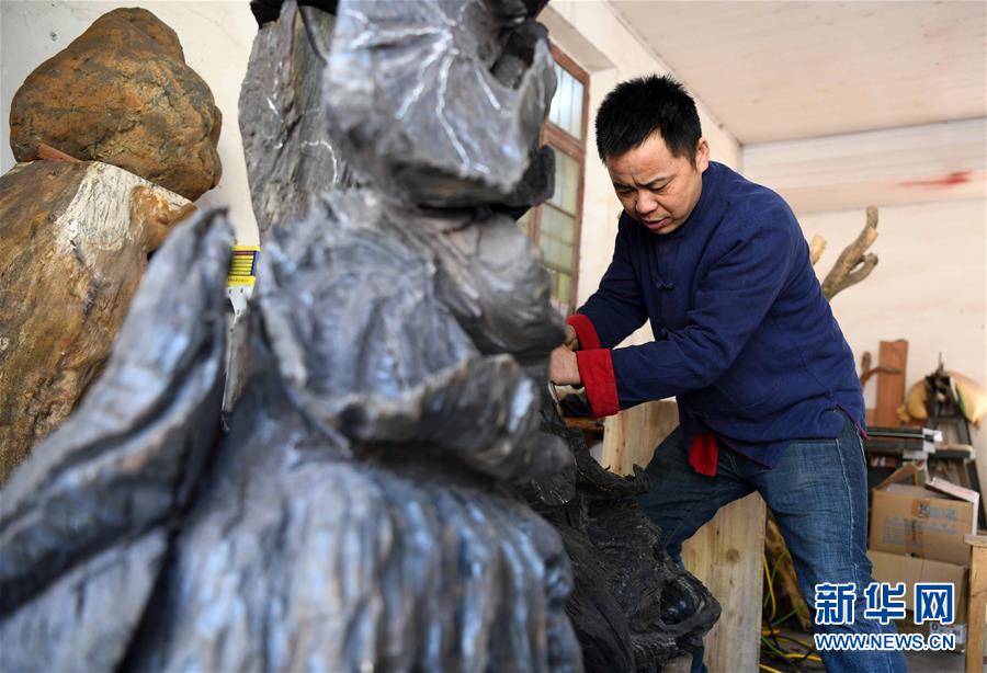 4月12日,丁勇刚在工作室内进行木雕创作。 新华社记者刘军喜摄