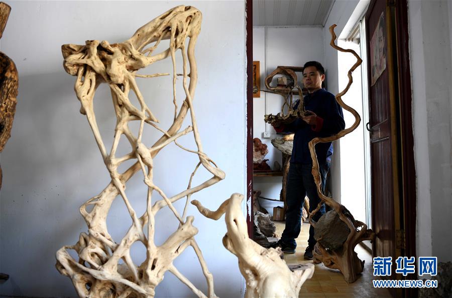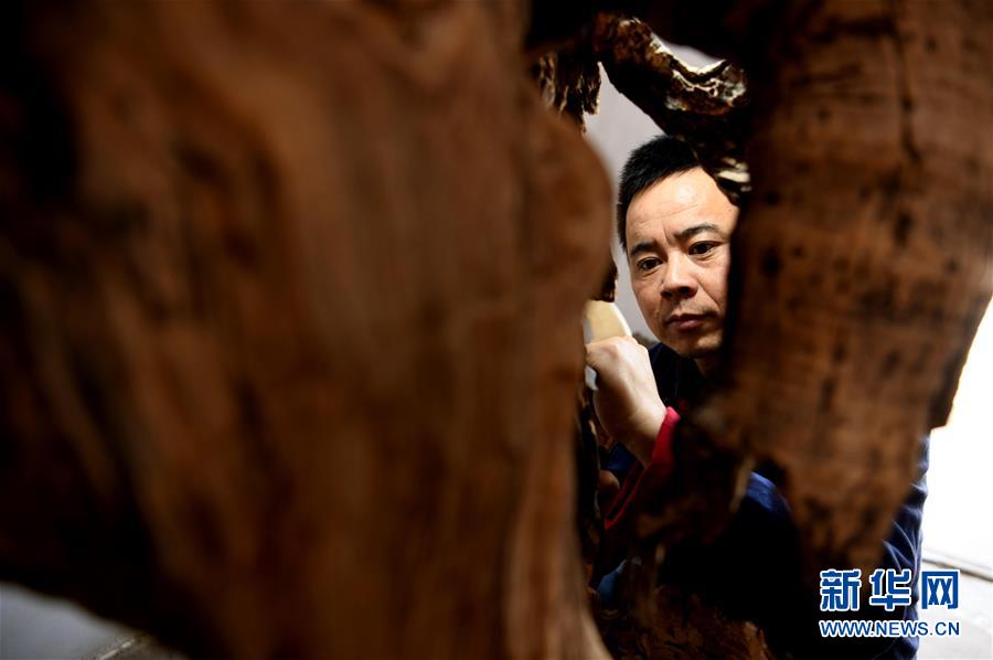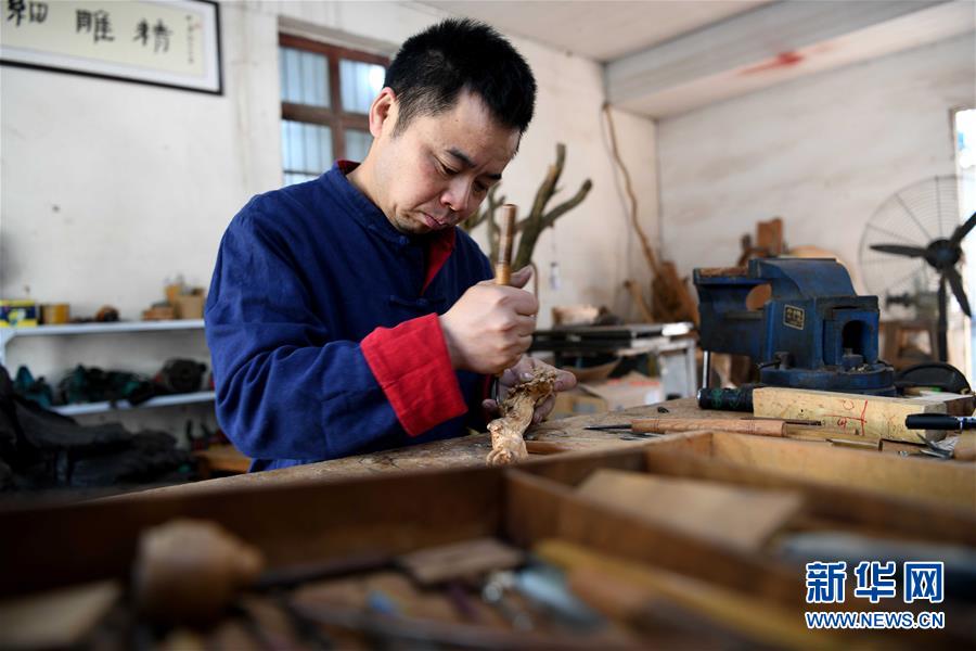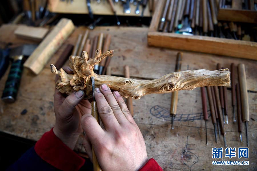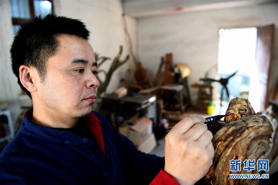 在丁勇刚的刻刀下,一些不起眼的树枝和树根等原材料被赋予了艺术价值。近年来,丁勇刚通过非遗展示、讲课交流等方式弘扬传统木雕技艺,让更多的人了解并传承这门手艺。