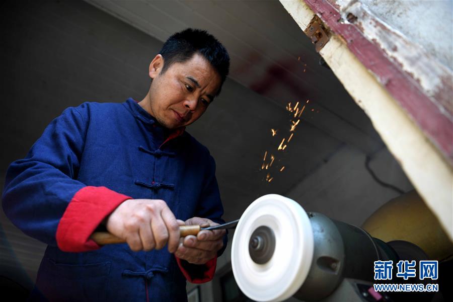 4月12日,丁勇刚在工作室内打磨刻刀。 新华社记者刘军喜摄