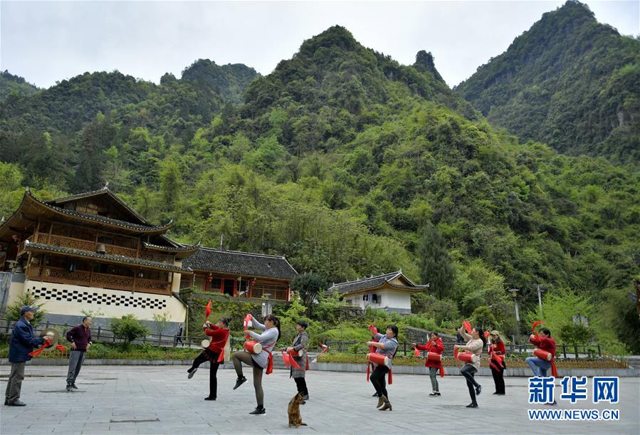 湖北宣恩:深山侗寨的新“田园生活” 湖北省宣恩县长潭河侗族乡两溪河村地处七姊妹山国家级自然保护区山脚下,是一个村民数不足1000人的侗族村落。近年来,当地整治村庄环境,修缮特色民居,依托特有的民族文化和自然风光发展旅游,让这个原本贫困的深山侗族村落走上致富之路。新华社发(宋文 摄)4月14日,湖北省宣恩县长潭河侗族乡两溪河村村民练习打腰鼓。 4月14日,湖北省宣恩县长潭河侗族乡两溪河村的村民在管护田园。 4月14日,湖北省宣恩县长潭河侗族乡两溪河村的妇女走出吊脚楼,前往广场参加文艺活动。