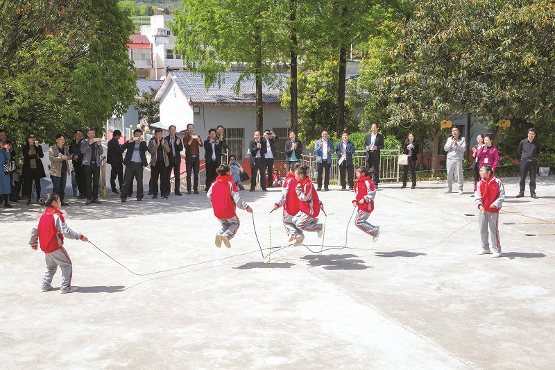 丹江口市习家店镇青塘小学学生为参会代表展示“8分钟连续22种花样跳绳”教学成果。