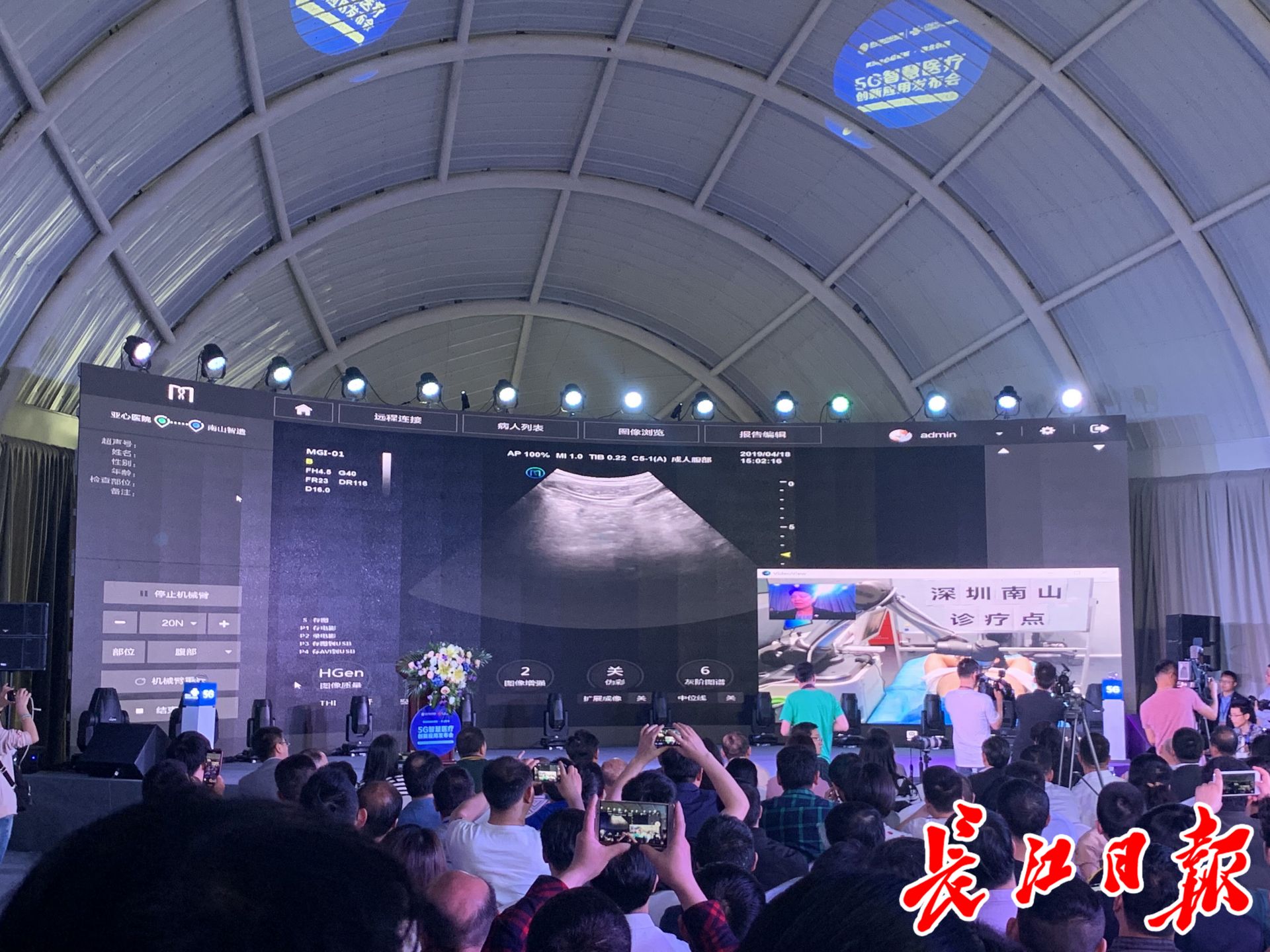 发布会上实景演示了远程医疗技术。长江日报记者现场看到,来自武汉亚心医院的医生通过5G技术,为深圳南山的一名患者实时进行肝脏B超的全方位检查。