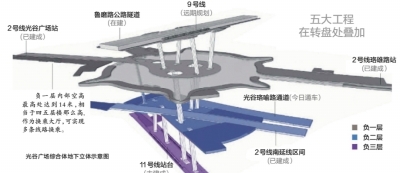 综合体内部设计为地下三层和一个夹层,包含2号线、11号线和9号线(远期规划)3条地铁和2条市政公路通道,5大工程在转盘处进行叠加。