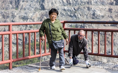 他们是一对残疾夫妻。男的用双手和一条半截腿走路,女的拄着拐杖。两人虽然步履艰难,但相互扶持,看到眼前的美景,笑得很开心。