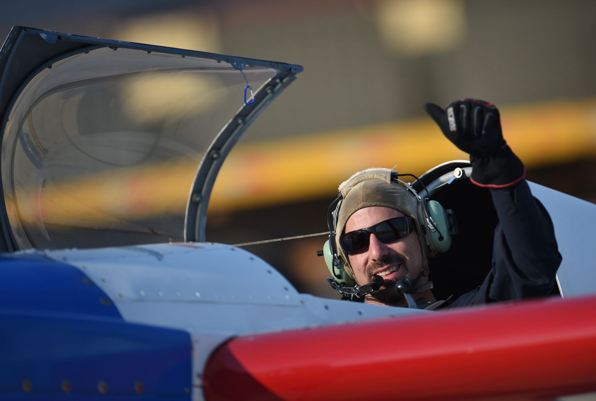 2017年首届“世界飞行者大会”,特技飞行员阿隆索在出发前与观众打招呼。记者郭良朔 摄