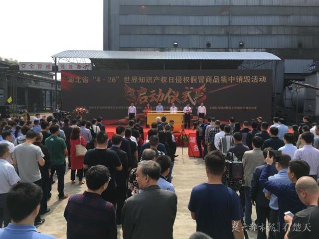 4月26日,湖北省“4.26”世界知识产权日侵权假冒商品集中销毁活动在咸宁市咸安区湖北汇楚危险废物处置有限公司举行。活动现场销毁了武汉、咸宁、黄冈等地查获的假冒伪劣商品,涉及服饰、箱包、酒类、汽车配件、日化用品等15大类、近300个品种,共计60万件,重量超过200吨,货值5000余万元。在此次集中销毁的假冒伪劣商品中,有假冒品牌葡萄酒5万余瓶,假冒品牌鞋1.7万余双,假冒洋酒5000多瓶。此次销毁活动采取粉碎、焚烧、填埋、拆解等方式依法进行,符合节能环保等相关规定。(视界网吴涛摄)