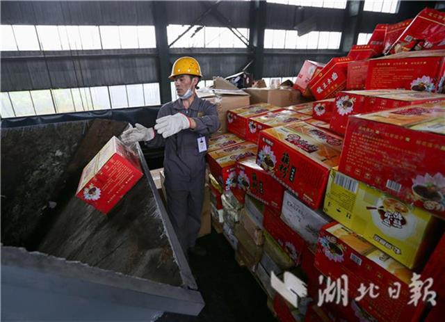 4月26日,咸宁市咸安区湖北汇楚危险废物处置有限公司破碎车间,操作人员正在把假冒食品投入破碎机中。