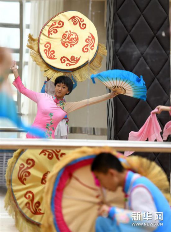 4月29日,在石家庄市第四十四中学舞蹈室,学生们排练井陉拉花。