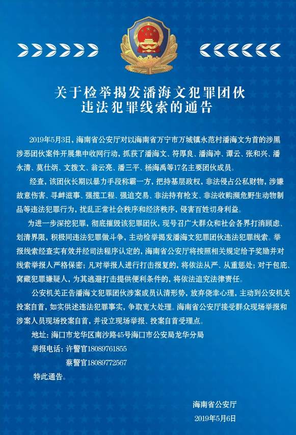 海口市公安局龙华分局侦办万宁市“潘海文涉黑涉恶犯罪团伙”案件情况通报