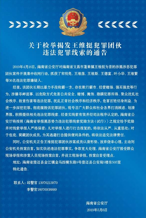 2019年2月21日,海南省公安厅收到关于文昌市王维挺等涉黑涉恶团伙的线索,在前期核查的基础上,确定为“王维挺为首的涉黑团伙案”,并指定由澄迈县公安局负责侦办。