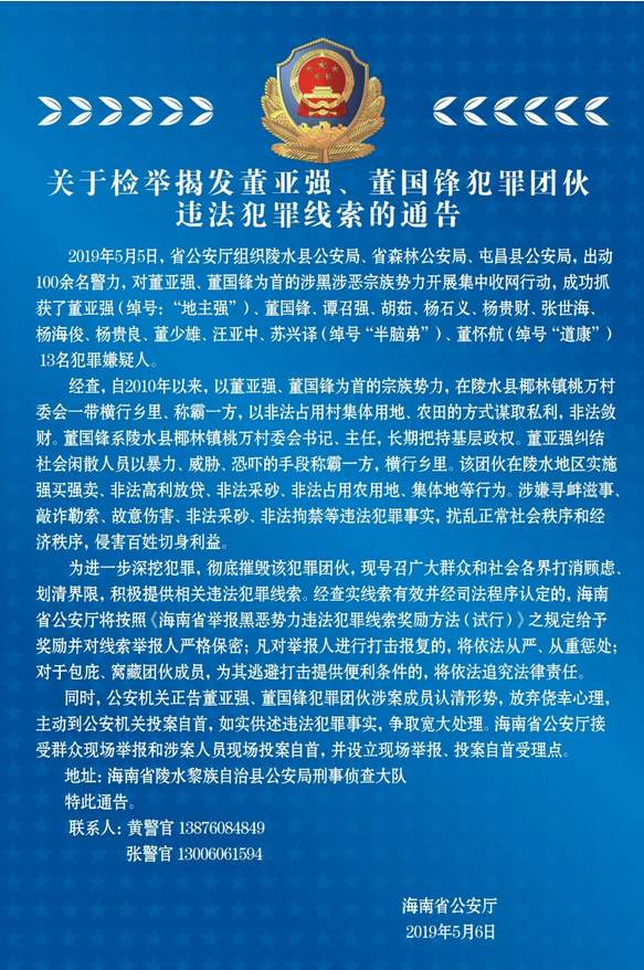 2019年5月5日,省公安厅组织陵水县公安局、省森林公安局、屯昌县公安局出动100余名警力,对董亚强、董国锋为首的涉黑涉恶宗族势力开展集中收网行动,成功抓获了董亚强(绰号:“地主强”)、董国锋、谭召强、胡茹、杨石义、杨贵财、张世海、杨海俊、杨贵良、董少雄、汪亚中、苏兴译(绰号“半脑弟”)、董怀航(绰号“道康”)13名犯罪嫌疑人,扣押查封涉案人员资产共计约合2500万元,现金35万元,扣押车辆9辆及金银首饰、烟酒一批,枪支2支。