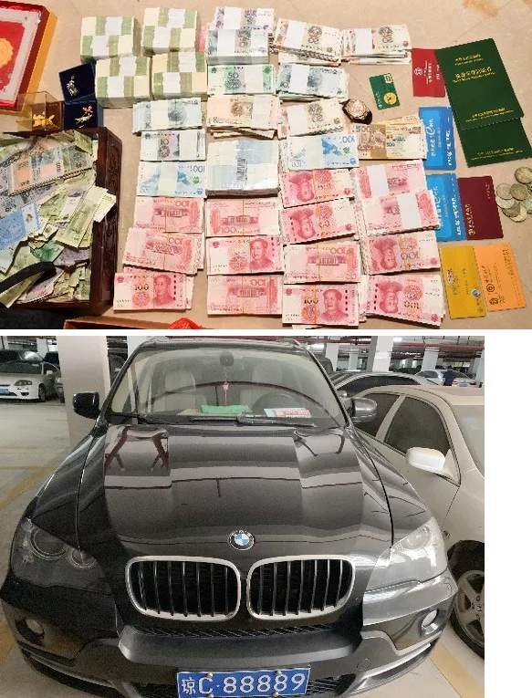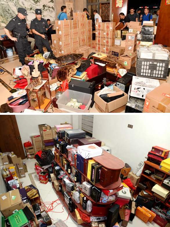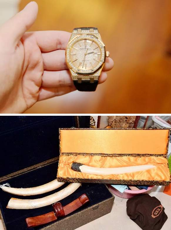 经对相关人员及场所开展搜查,目前查封扣押汽车4辆、现金约65万元,名酒约180箱、现场缴获改制枪支1支,濒危野生动物制品玳瑁5只、象牙3只,沉香花梨制品11件,金银首饰40余件,名包名表等奢侈品一批,冻结银行资金200万元左右。