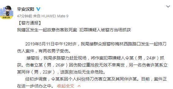 @平安汉阳 通报称,11日中午12时许,该局接群众报警称梅林西路路口发生一起持刀伤人案件,有两名男子受伤。接警后,我局多路警力赶赴现场,将作案犯罪嫌疑人令某(男,24岁)抓获。伤者立某(男,26岁)因伤势过重抢救无效不幸离世,另一名伤者许某系立某同伴(男,22岁),已送医救治,无生命危险。