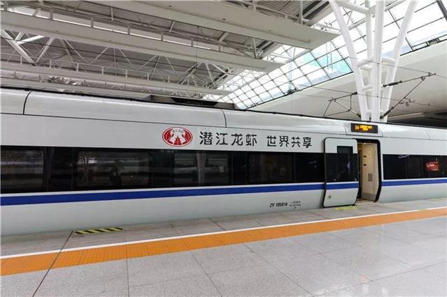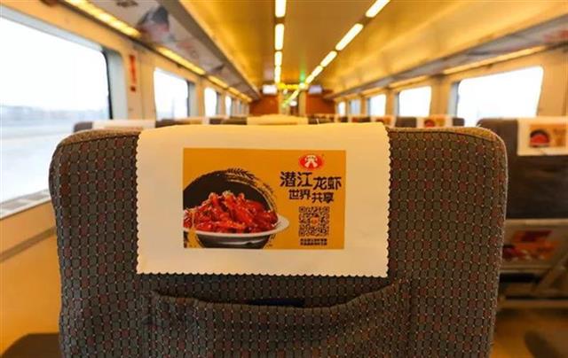 在冠名的和谐号列车上,潜江龙虾品牌元素几乎融入到列车各个环节,涉及车身外彩贴、车内外门贴、头片、海报、桌贴、品牌天幕、创意贴、LED显示屏以及语音播报等。据称,冠名列车每天车次不固定,但线路固定。