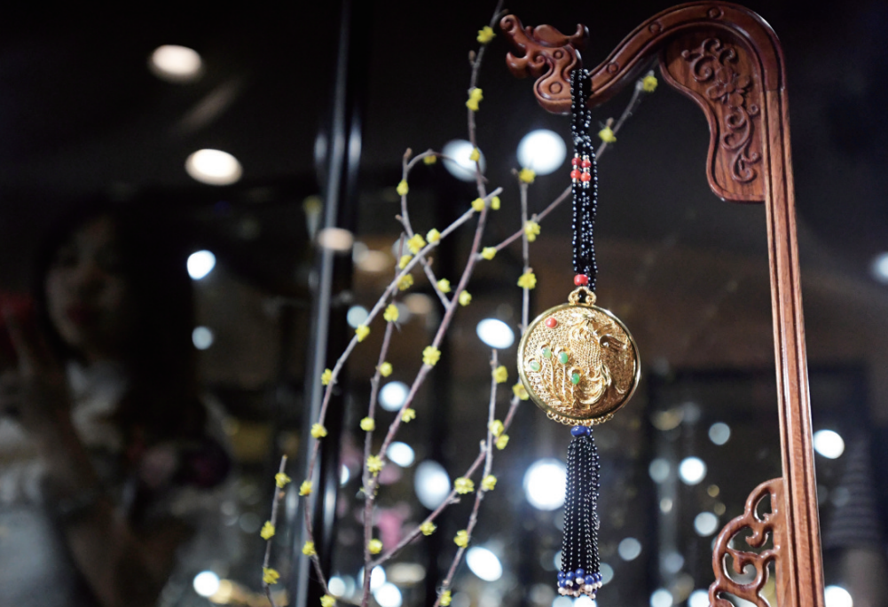 国家非遗花丝镶嵌制作技艺传人程淑美大师的藏品流光溢彩,引得市民流连。记者刘斌 摄